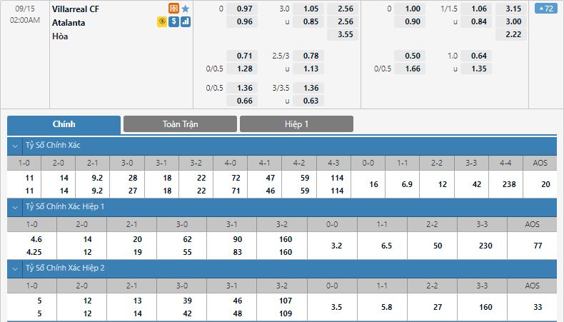 Bảng tỷ lệ kèo bóng đá Villarreal vs Atalanta
