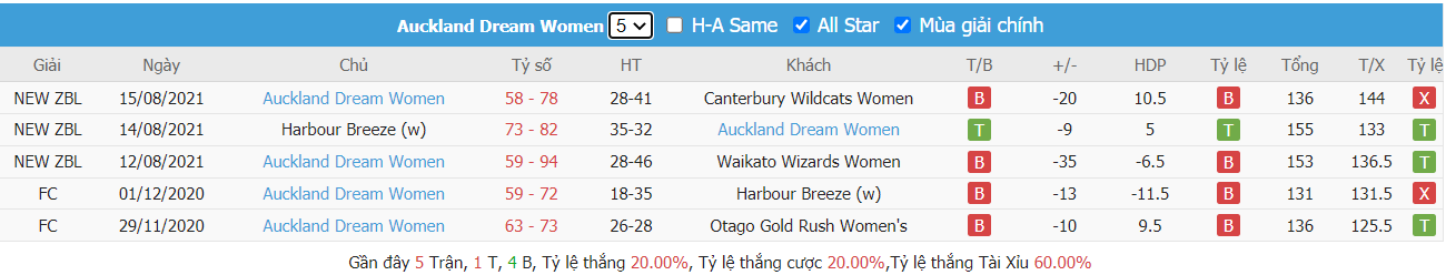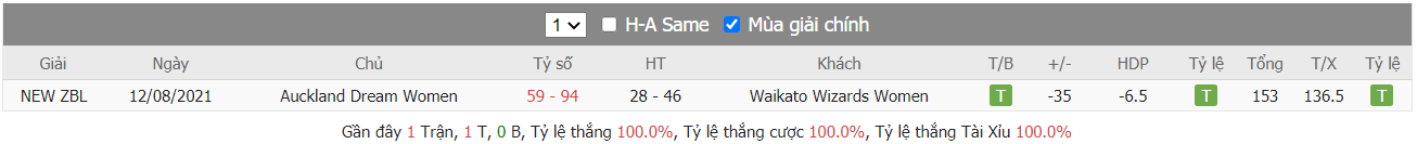 Bảng tỷ lệ kèo Waikato Wizards vs Auckland Dream