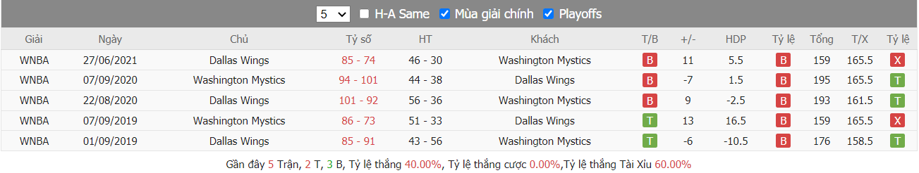 Thành tích đối đầu Washington Mystics vs Dallas Wings
