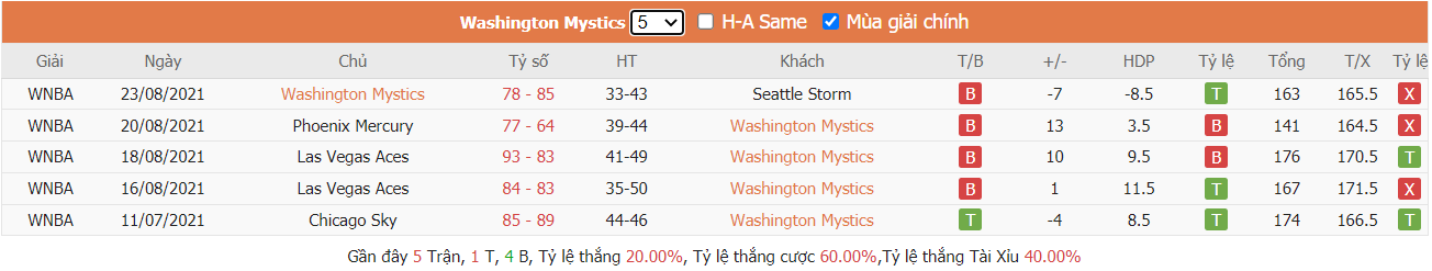 Phong độ gần đây Washington Mystics vs Dallas Wings
