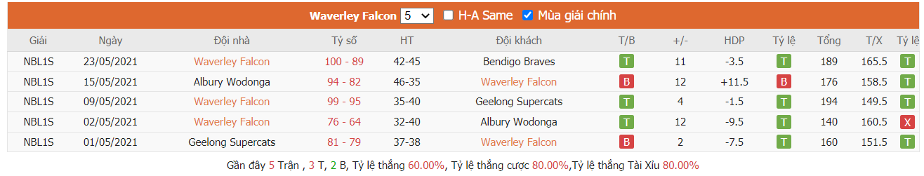 Thống kê cũng chỉ ra mặc dù được đánh giá cao ở trận đấu tới nhưng Waverley Falcons vốn vẫn không phải là đội bóng quá mạnh về tấn công khi chỉ ghi được trung bình 115 điểm mỗi trận trong 3 trận đón khách đã qua, trong khi ở hàng phòng ngự với những cú block sấm sét và những pha rebound chỉ bị mất trung bình 102 điểm mỗi trận trong thời gian kể trên. Từ đó dẫn đến 6 trên 7 trận ra sân gần nhất của Waverley Falcons cũng có kết quả chung cuộc về xỉu. Như vậy cửa xỉu vẫn là một lựa chọn sáng hơn với giới đầu tư ở trận này, nhất là khi cũng đã có tới 4 trên 5 trận so tài gần nhất của hai bên cũng có kết quả chung cuộc về xỉu.