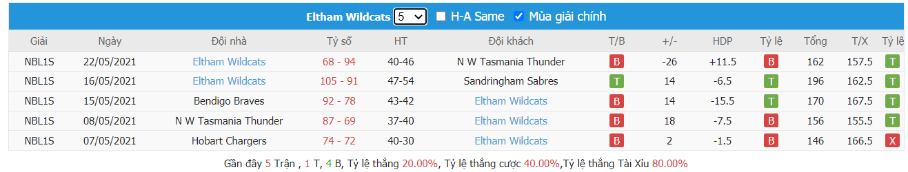 Trong khi đó tiếp đà hưng phấn sau khi giành được chiến thắng ở vòng đấu trước đó, Eltham Wildcats tiếp tục khởi sắc khi mới đây đã vượt qua đối thủ ngay trên sân khách với tỉ số sát sao 93-92 chung cuộc. Giành được 2 chiến thắng gần nhất nhưng Eltham Wildcats đã toàn thua trong cả 5 vòng đấu mở màn nên đội khách hiện chỉ đang tạm xếp ở vị trí thứ 12 trên BXH. Trong trận đấu vừa qua Bradley tiếp tục là cây săn bàn chủ lực cho Eltham Wildcats khi đã ghi được cú double-double ấn tượng với 27 điểm, 10 điểm rebound cùng với 5 đường chuyền kiến taọ. Tiếp tục sắm vai đội khách ở trận đấu tới Eltham Wildcats tiếp tục được kì vọng sẽ giành được chiến thắng khi đã ca được khúc khải hoàn trong 2 trận hành quân xa nhà gần đây nhất.