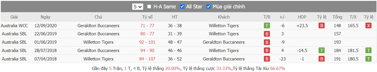 Bảng tỷ lệ kèo Willetton Tigers vs Geraldton Buccaneers