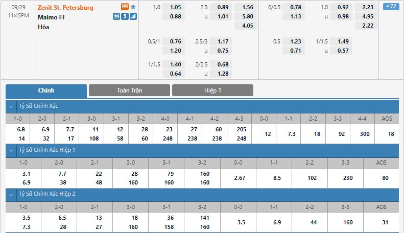 - Kèo tỉ số hiệp 1: Zenit Saint Petersburg 1-0 Malmo FF